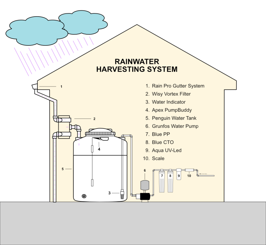 Rain water catchment for household use and a septic system with recycled grey water for lawn and garden.
