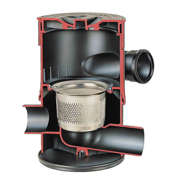 This is the largest version of the Wisy Vortex filter, designed specifically for larger buildings. The 300mm diameter inlet pipe makes the filter suitable for roof areas up to 3000m2. The filter efficiency remains above 90% at flows up to 13 litres/second, and the unit can process a maximum flow rate of 80 l/s. The extremely robust construction means it has a gross vehicle weight rating of 60 tonnes, the only filter unit capable of taking heavy goods traffic without the need for a separate chamber. The Wisy Vortex WFF300 filter is supplied complete with a heavy gauge stainless steel base-plate to provide stability when installed below ground. This also enables the filter to be used above ground by having the baseplate span brick pillars or similar.